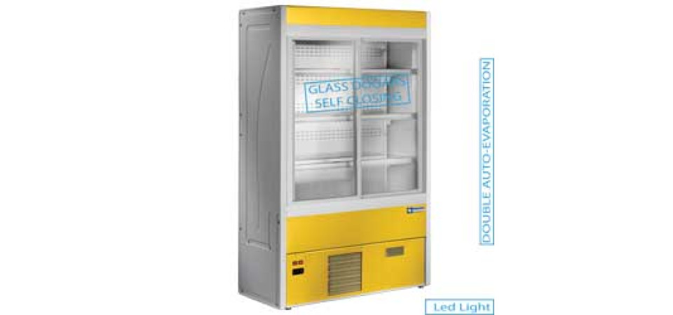 hűtött faliregál önműködően visszazáródó üveg tolóajtókkal, ventilációs hűtéssel, R404A hűtőközeggel, csökkentett mélységgel, 3 db 280 mm mélységű állítható magasságú ársínnel ellátott polccal és 375 mm mélységű alsó bemutatótálcával, beépített kétoldali led világítással, digitális vezérléssel és hőmérsékletkijelzéssel, +3/+6°C között szabályozható hűtési hőmérséklettel, 3. klímaosztályú besorolással (+25°C), belül rozsdamentes acél, kívül elöl-hátul sárga dekoros festett acél burkolattal és műanyag oldalfalakkal - Nincs belőle raktárkészlet, csak megrendelésre minimum 1 hónapos szállítási határidővel !