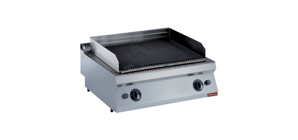 blokkba építhető asztali gázüzemű 2 zónás lávaköves sütő, állítható magasságú 730x540 mm méretű öntött vas sütőráccsal, körben fröccsenésgátló felhajtással, piezo gyújtással, mechanikus hőfokszabályozással, égéstermék elvezetővel, rozsdamentes acél kivitelben, szintezhető acél lábakkal (150-200 mm)