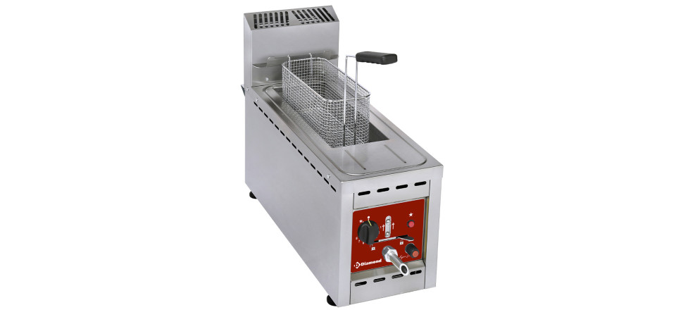 asztali gázüzemű 1x8 literes fritőz fokozottabb igénybevételhez, égéstermék elvezetővel, hideg zónával, rozsdamentes acél olajleeresztő csappal, 130x320x140 mm méretű hőszigetelt fogantyús sütőkosárral, piezo elektromos benyújtással, max. 190°C-os mechanikus hőmérsékletszabályozással, rozsdamentes acél burkolattal, szintezhető talpakkal