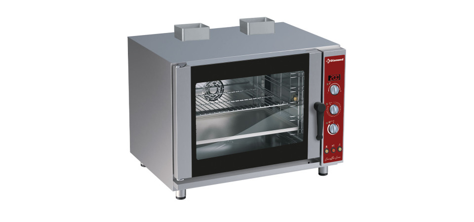 gázüzemű légkeveréses sütő cukrászati és sütőipari célra, 5x EN 600x400 mm vagy 5x GN 1/1 kapacitással, 75 mm-es tartósín távolsággal, 660x420x450 mm-es belmérettel, fokozatosan szabályozható automatikus párásítással, 1 db 2 sebességes (1500/2800 fordulat/perc teljesítményű) automatikusan forgásirányt váltó ventilátorral, belső világítással, nyitásérzékelő mikrokapcsolóval, biztonsági termosztáttal, 50-270°C közti mechanikus hőmérsékletszabályozással, 1-120 perces (vagy folyamatos üzemű) időzítővel, digitális hőmérsékletkijelzéssel, 2 rétegű hőszigetelt üvegbetétes kondenzvíz elvezetéses sütőajtóval, hőszigetelt ergonómikus fogantyúval, lekerekített belső sarkokkal, kívül-belül rozsdamentes acél burkolattal, szintezhető talpakkal, 1 db 600x400 mm-es sütőráccsal szállítva