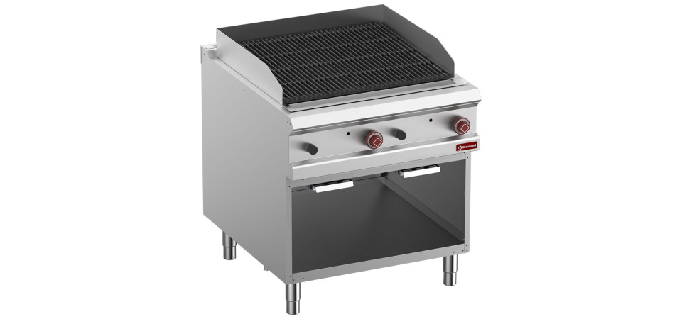 blokkba építhető gázüzemű lávaköves sütő (2x 10 kW), 2x 368x638 mm méretű állítható magasságú kétoldalú öntöttvas sütőráccsal (hús/hal), körben fröccsenésgátló felhajtással, cseppfogó tálcával, alul nyitott GN 2/1-es (760x740x360 mm) belméretű alsó polcos készüléktartó pulttal, rozsdamentes acél kivitelben, állítható rozsdamentes acél lábakkal